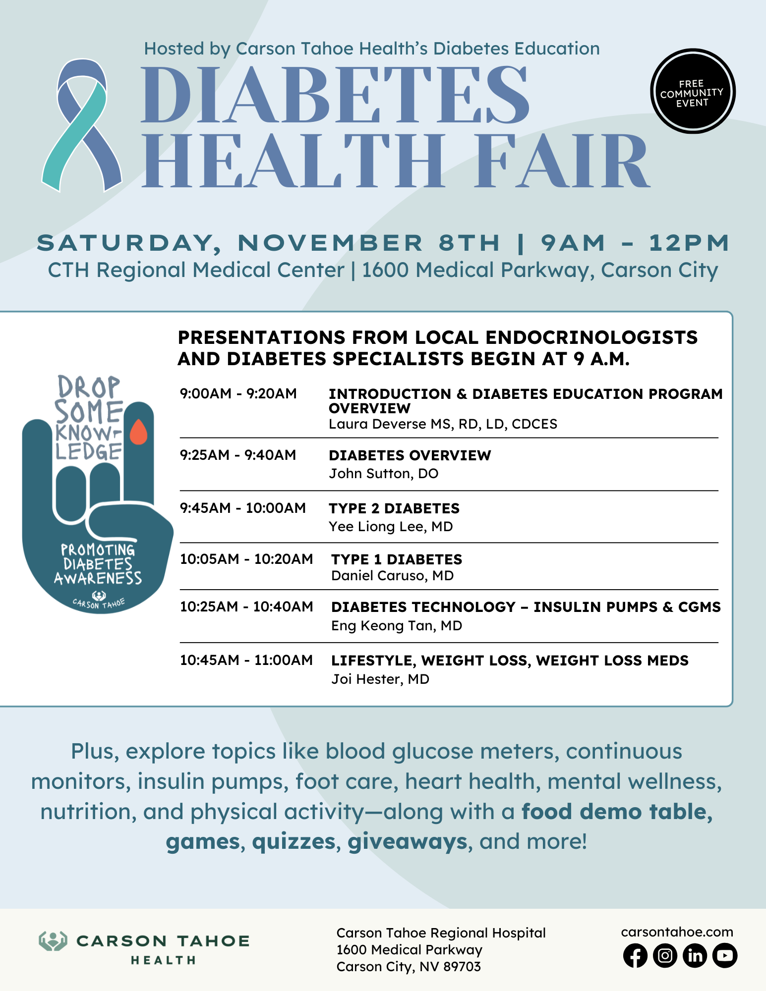 November is Diabetes Awareness Month. Our annual diabetes health fair is planned for Saturday November 8, 2025. Stay tuned for more information.
